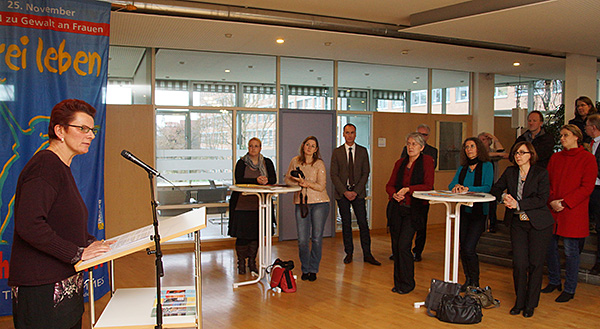 Redner waren (v.r.n.l.): Martina Kaplan (Polizeireferat Prävention), Armin Krohe-Amann (Beratungsstelle sexualisierte Gewalt und PfunzKerle e.V), Micha Schöller (Beratungsstelle sexualisierte Gewalt und der Beratungsstelle Frauen helfen Frauen Tübingen e.V.), Lucia Köberlein, Ulrike Schneck (Psychologin refugio Stuttgart e.V.), Dr. Katharina Rall (Oberärztin der Frauenklinik) und Opferanwältin Susanne Hoppe-Willmann. |