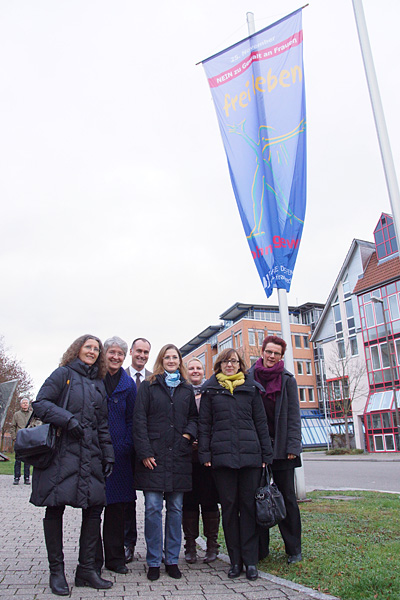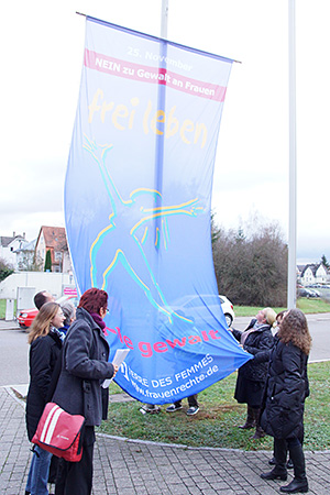 die TERRE DES FEMMES-Fahne vor dem Regierungspräsidium Tübingen