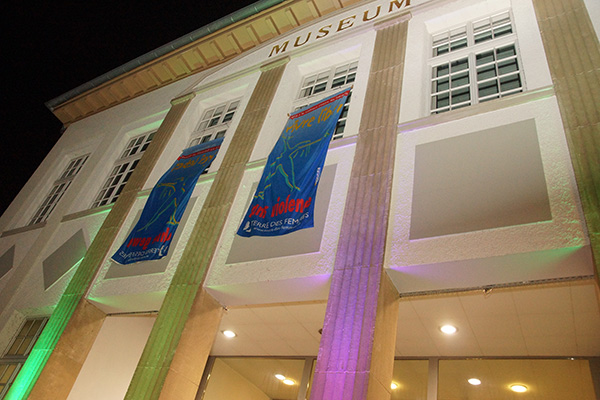 Bei der Eröffnung erstrahlt das Kino Museum in Magenta und die Fahnen von